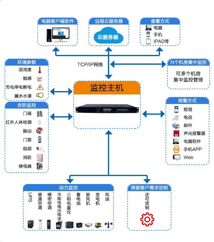 建大仁科的配電室環(huán)境監(jiān)測(cè)系統(tǒng)由溫濕度傳感器、水浸傳感器、空調(diào)控制器、空氣質(zhì)量傳感器等檢測(cè)設(shè)備、監(jiān)控主機(jī)以及監(jiān)測(cè)平臺(tái)組成,能夠?qū)崟r(shí)采集配電室環(huán)境數(shù)據(jù),并上傳至監(jiān)控軟件平臺(tái),形成遠(yuǎn)程集中監(jiān)控+數(shù)據(jù)分析+智能干預(yù)模式,實(shí)現(xiàn)配電室的全信息采集以及自動(dòng)化運(yùn)行管理、安全防護(hù)。