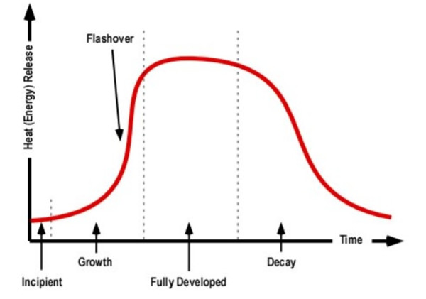 首先,我們先來了解一下火災(zāi)發(fā)生線時(shí)間線,火災(zāi)發(fā)展時(shí)間線是指在一個(gè)封閉的區(qū)域里,火災(zāi)從起初階段(incipient), 火勢(shì)增長(Growth), 轟燃(Flashover), 充分燃燒(Fully Developed) 到衰減(Decay) 五個(gè)階段??v坐標(biāo)是熱釋放率,可以簡單的理解為火勢(shì)的大小。